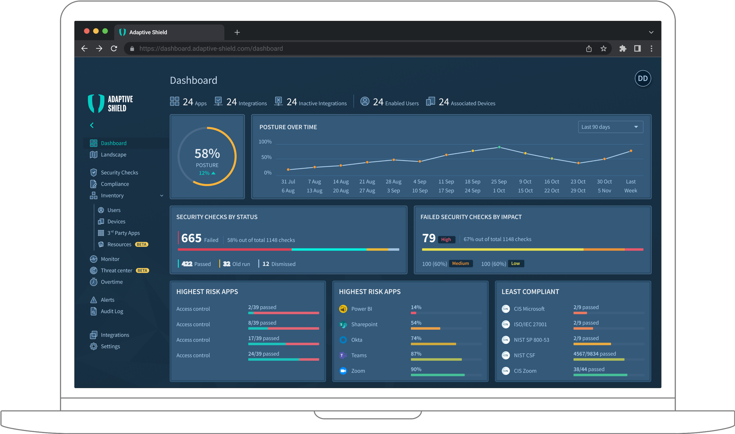 Adaptive Shield is a platform that integrates with the client's SaaS for continuously monitoring and analyzing each SaaS security configuration, identifying the weakest links and allowing to make the most out of the built-in controls.