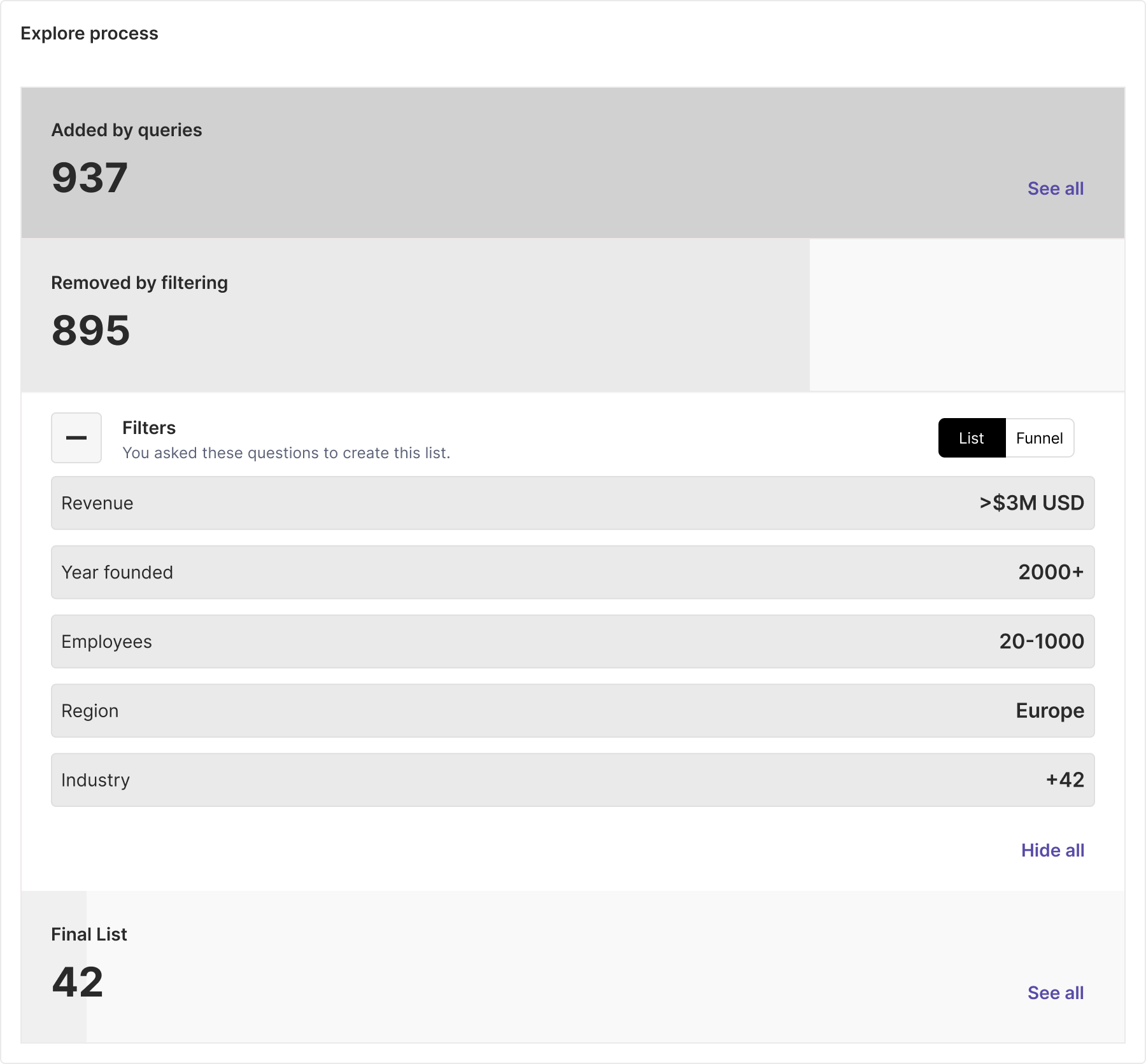 Impact: Users can track each step of refinement and understand why companies were included or excluded
