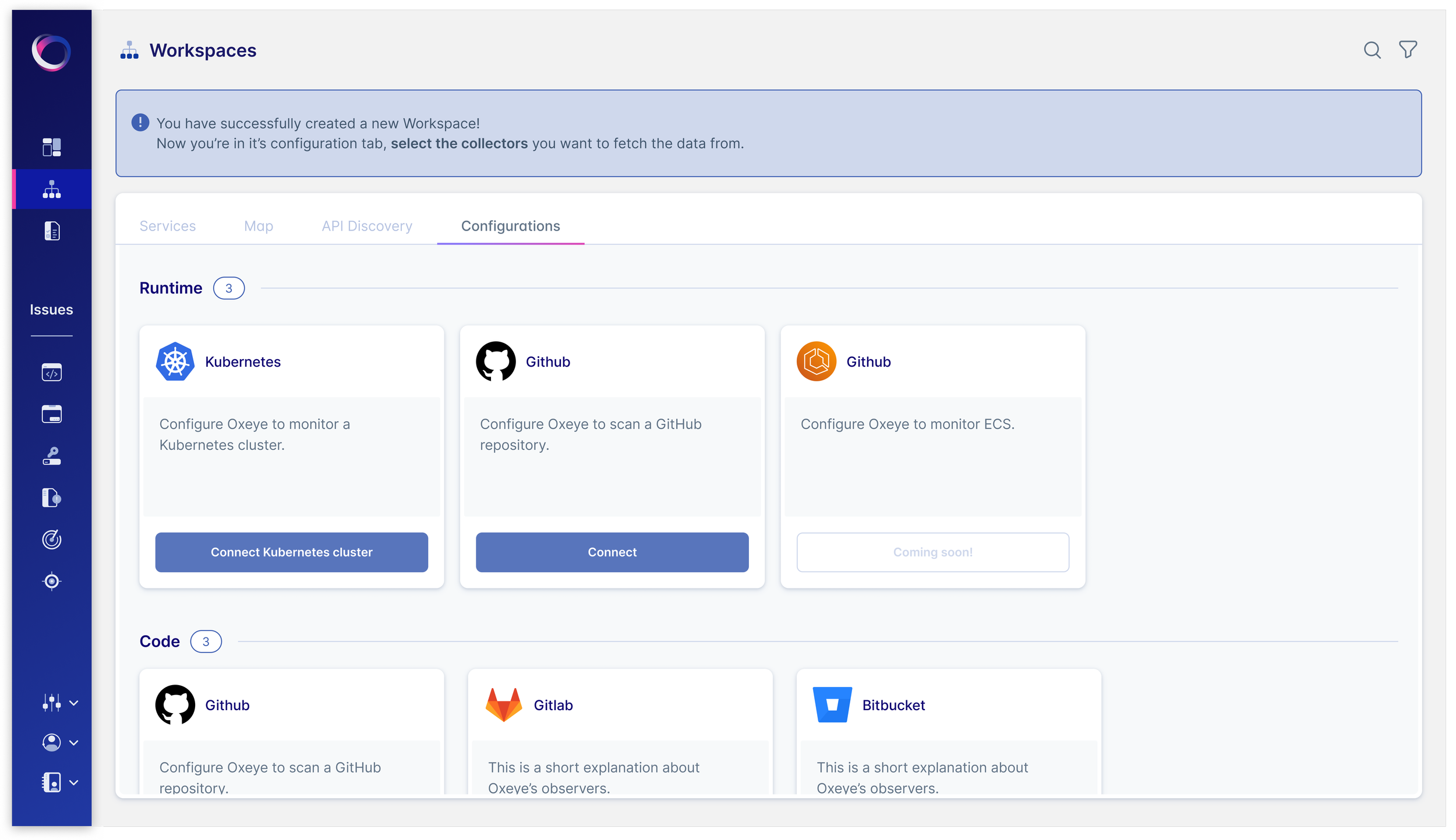 Oxeye monitors your applications and services through designated workspaces. A workspace is a collection of runtime services, container registries and code repositories comprising an application. Oxeye connectors monitor all these different artifacts to detect and contextualize all issues and vulnerabilities, and display them in the Oxeye user interface.